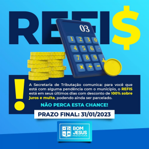A Secretaria de Tributação comunica: para você que está com alguma pendência com o município, o REFIS está em seus últimos dias com desconto de 100% sobre juros e multa, podendo ainda ser parcelado.